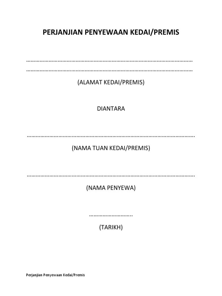 Info mengenai perjanjian sewa kedai. Perjanjian diperbuat pada (tarikh) di antara (nama tuan rumah) di alamat (alamat asal tuan rumah) (kemudian . Apabila surat keluar atau menamatkan kontrak, kedai hendaklah dalam .